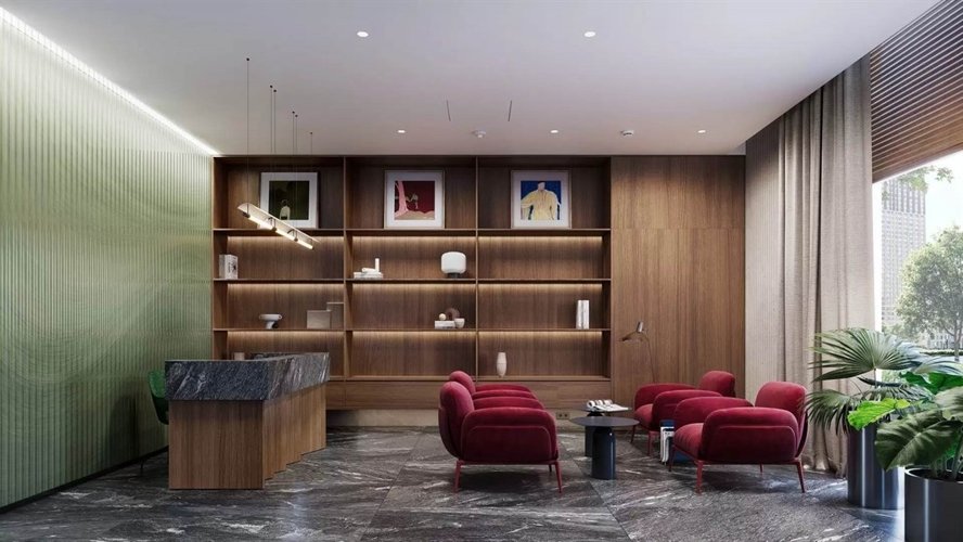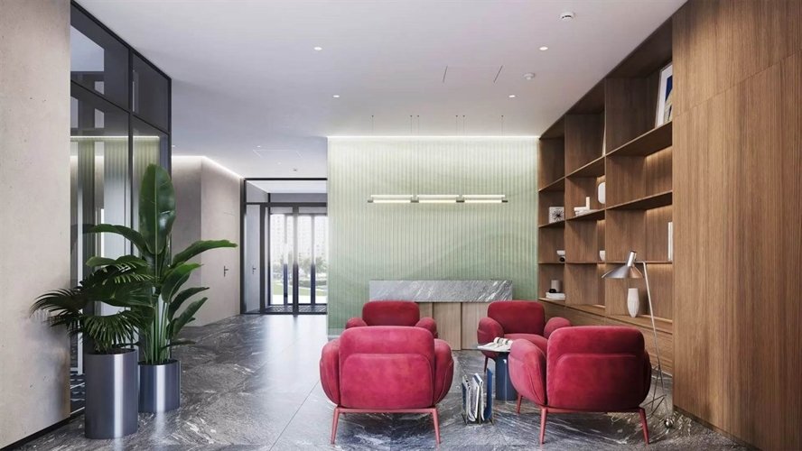 Лаундж-зоны с мягкой мебелью. Гостевые санузлы, помещения для хранения колясок. Почтовые ящики, интегрированные в плоскость стен. Помещение для мойки лап собак. Витражное остекление входных групп